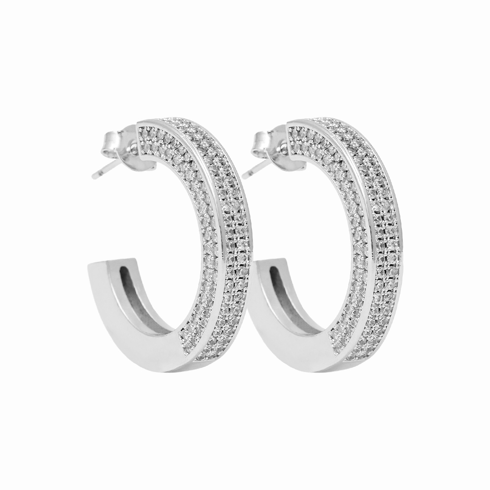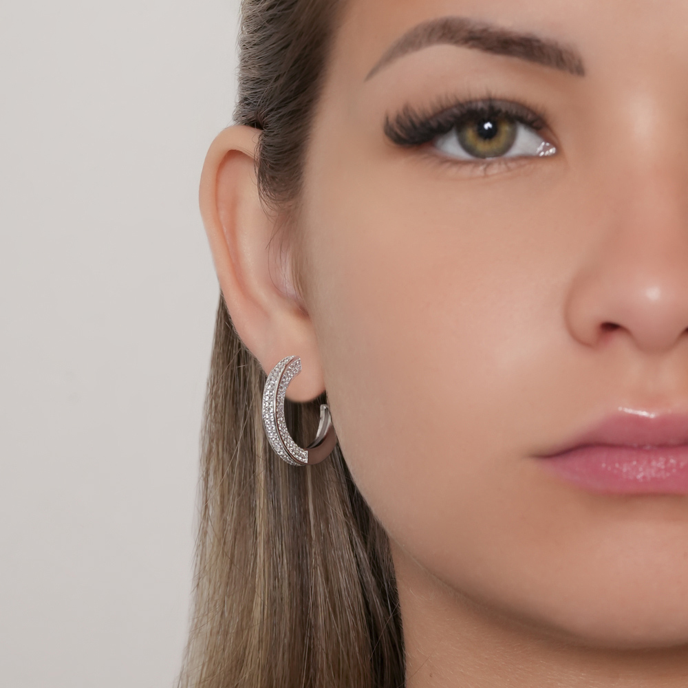 Argola Cravejada banhada a Ouro Branco bom design duplo e fileiras de zircônias cristais, perfeita para quem busca elegância e brilho em uma peça moderna e sofisticada. Ideal para eventos e looks refinados.