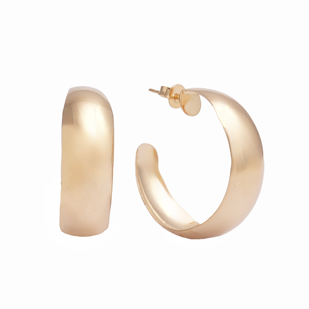 O brinco argola lisa curva apresenta um design contemporâneo com formato levemente alongado e acabamento polido que reflete a luz com delicadeza. Sua estrutura robusta transmite sofisticação e presença, mantendo ao mesmo tempo conforto para o uso prolongado. É uma peça versátil que combina com diferentes estilos, do minimalista ao elegante, valorizando a produção com discrição refinada. Recebe banho em ouro, garantindo brilho intenso, durabilidade e excelente qualidade.