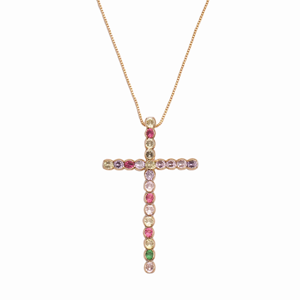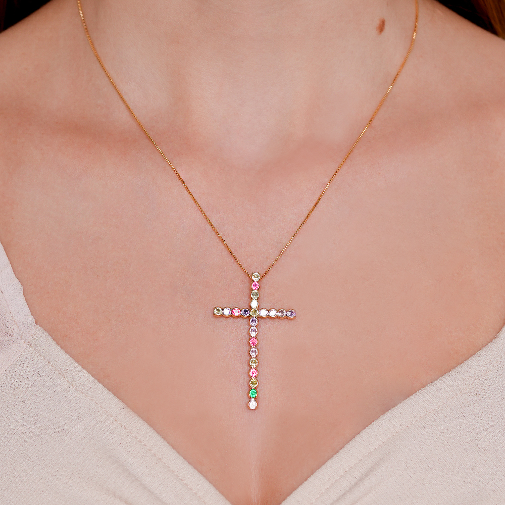 Colar Cruz com Zircônias Coloridas no Dourado – Fé com Estilo e Cores Vibrantes