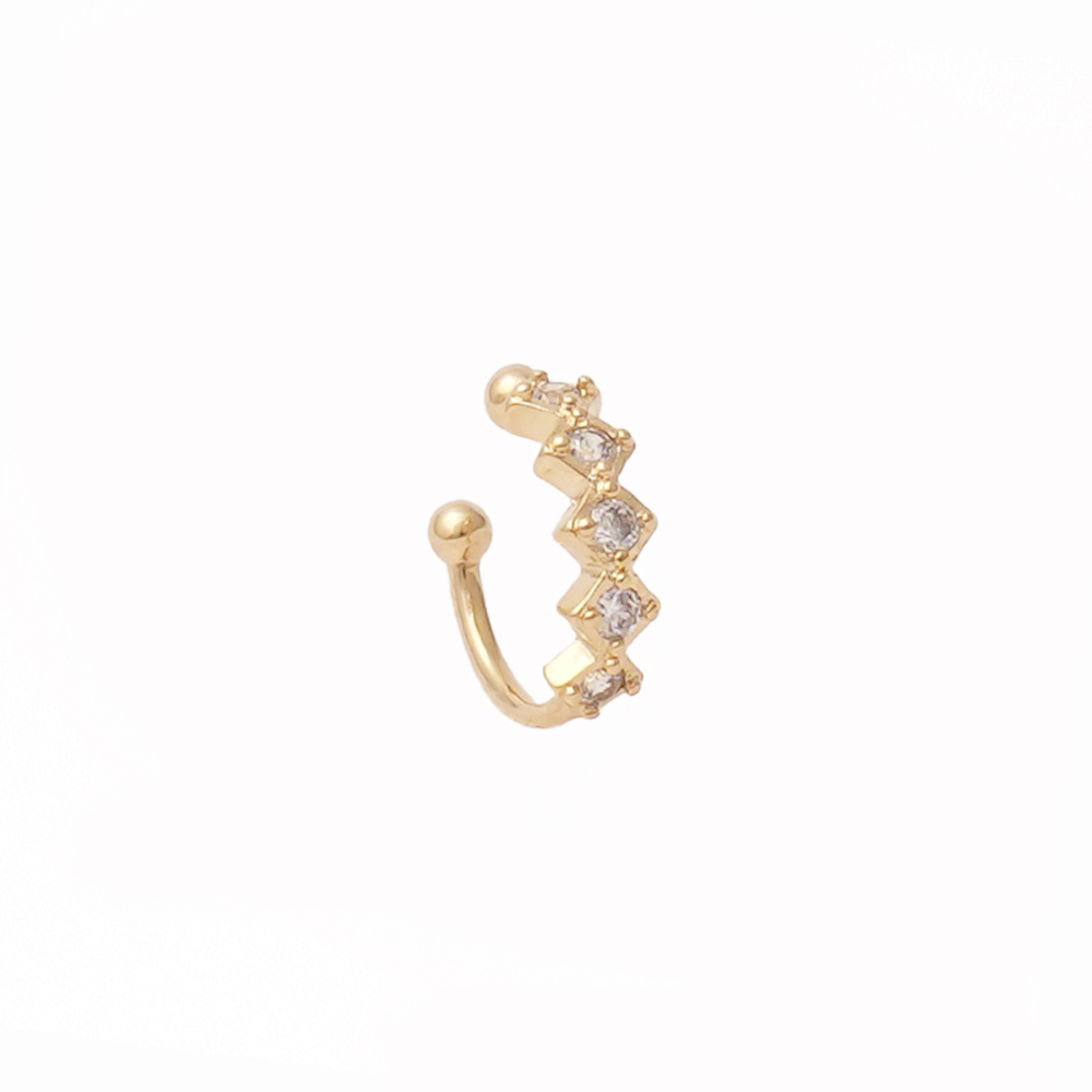 Traz um design geométrico moderno, com delicados losangos cravejados de zircônias que adicionam brilho e sofisticação à peça. Banhado a ouro 18K, este piercing é ajustável e não requer furo, proporcionando conforto e estilo em qualquer ocasião. Ideal para quem busca um acessório diferenciado e prático para o dia a dia.