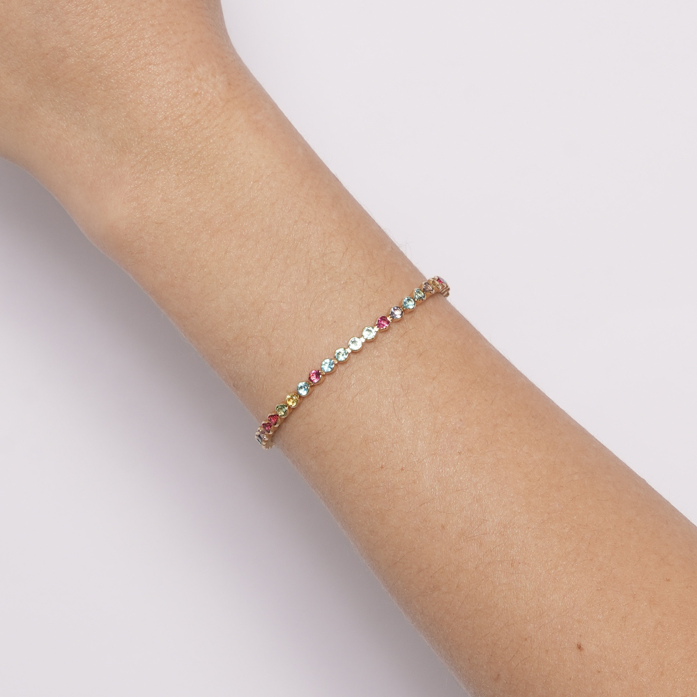 Combinação perfeita entre sofisticação e delicadeza. Seu design clássico e refinado destaca o brilho das zircônias coloridas, criando um acessório versátil e atemporal. Ideal para quem busca uma peça diferenciada, com a durabilidade e o acabamento impecável do ouro 18K, essa pulseira é perfeita para complementar qualquer look.